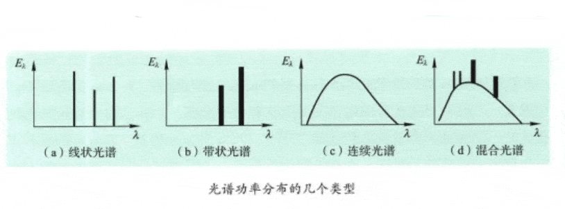 其中(a)稱為線狀光譜,它由若干條明顯分隔的細線組成,如低壓鈉燈發(fā)出的光線就是由波長為589.0nm和589.6mm的兩條黃色光線構(gòu)成的。圖(b)稱為帶狀光譜,由一些分開的譜帶構(gòu)成,每個譜帶又包含許多緊靠的譜線,如碳弧和高壓汞燈就屬于這種分布。圖(c)稱為連續(xù)光譜,它包含一定范圍內(nèi)所有波長的輻射譜線,且能量隨波長平滑變化。所有熱輻射光源都屬于這種情況,如日光和白熾燈光等,這是光源中常見的一種分布。圖(d)稱為混合光譜,是前述光譜的組合,日常生活中常用的熒光燈就屬于這種分布。