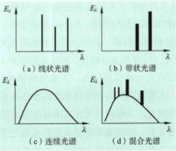 線狀光譜是由若干條明顯分隔的細(xì)線組成,如低壓鈉燈發(fā)出的光線就是由波長為589.0nm和589.6nm的兩條黃色光線構(gòu)成的。帶狀光譜是由一些分開的譜帶構(gòu)成,每個譜帶又包含許多緊靠的譜線,如碳弧和高壓汞燈就屬于這種分布。連續(xù)光譜包含一定范圍內(nèi)所有波長的輻射譜線,且能量隨波長平滑變化,所有熱輻射光源都屬于這種情況,如日光和白熾燈光等,這是光源中常見的一種分布。混合光譜是前述光譜的組合,日常生活中常用熒光燈就屬于這種分布。