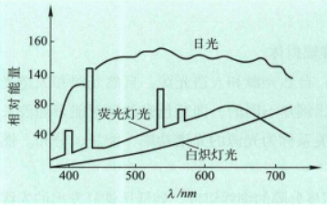 上圖為常見光源的光譜能量分布曲線。白熾燈在長波的紅色段相對輻射能量高,因而看上去顏色偏紅;而熒光燈在藍(lán)、綠色波段相對輻射能量較高,紅色波段的相對輻射能量較低,因而看上去呈藍(lán)白;日光光譜則相對比較均衡,在可見光范圍內(nèi)能量起伏不大。